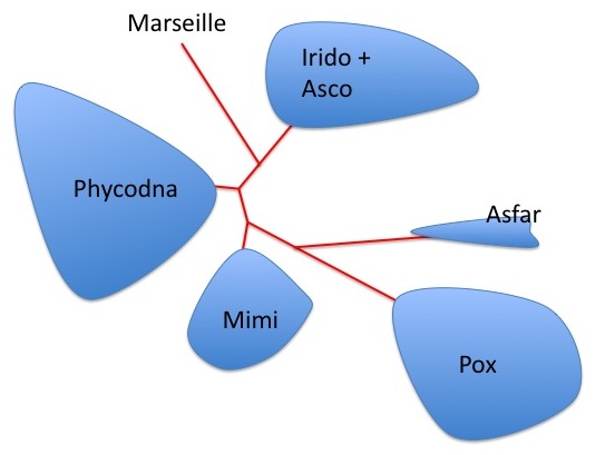 Phylogenetic reconstruction of NCLDV members. Redrawn and simplified from Fig. 4. The unrooted Bayesian Inference tree was generated from a 263-aa alignment of conserved regions of DNA polymerase B