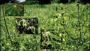 Main picture: cassava plant showing the effects of severe ACMD. Note lack of leaves, and of neighbouring plants. Insets, top: healthy leaves; middle, mild infection; bottom, severe infection. All photographs by EP Rybicki, taken in western Kenya, June, 1997