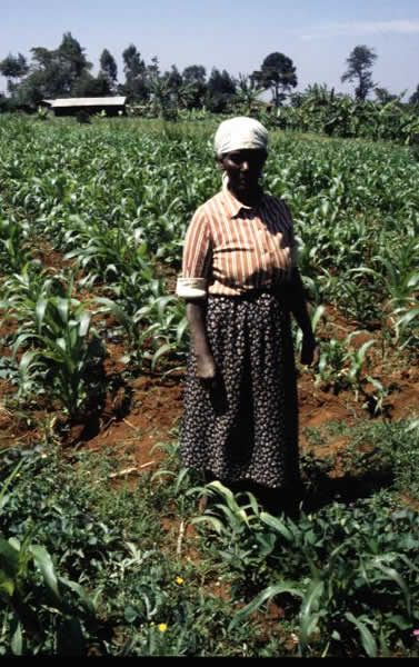Mrs Pauline Ruiru, on her farm near Githungiri, Kenya, in 1997 – note the devastated maize infected with MSV